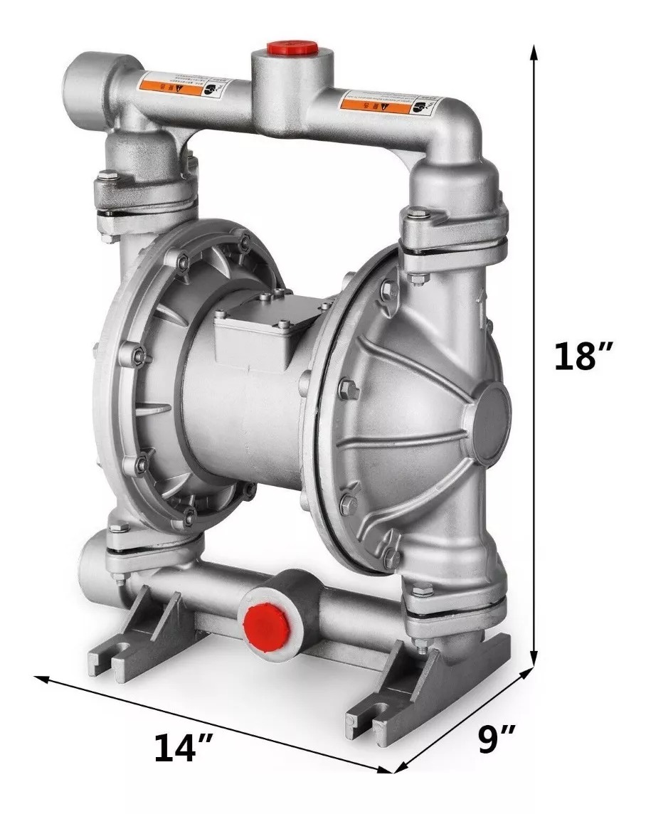Bomba de doble diafragma neumática con entrada y salida de 1 pulgada. Esta potente bomba neumática de diafragma doble funciona de 29 a 115 PSI. Cuenta con una entrada de 1 pulgada y salida dd 1 pulgada, capaz de bombear hasta 24 galones / min a temperaturas de hasta 80 grados F.