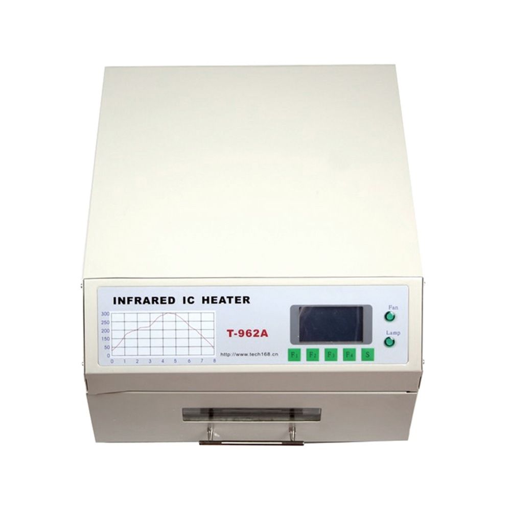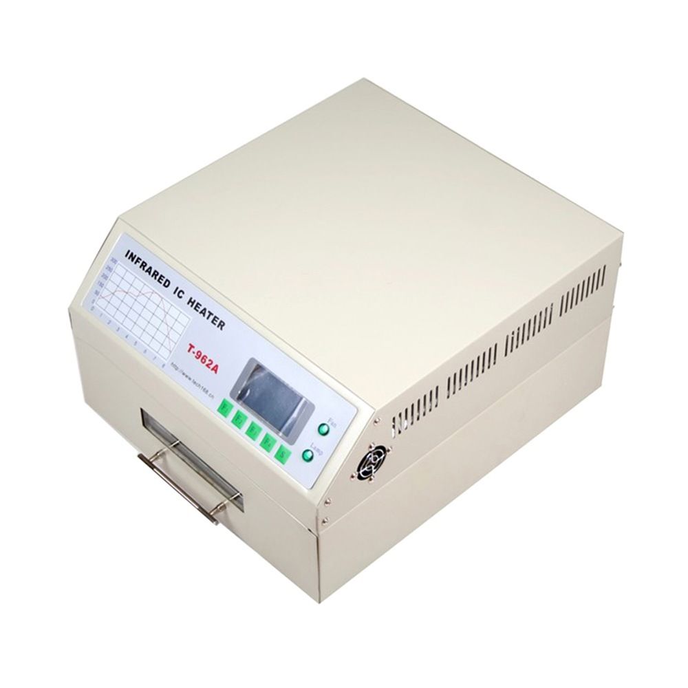 La interfaz de usuario se implementa mediante teclas de entrada T962A y una pantalla LCD. Los modos de calentamiento predefinidos se seleccionan mediante la interacción del usuario con el progreso del ciclo térmico observado en la pantalla LCD. El T962A puede utilizarse para "re-flow" automáticamente la soldadura para corregir juntas mal soldadas, remover / reemplazar componentes defectuosos y completar pequeños modelos de ingeniería o prototipos. Un cajón con ventanas está diseñado para sujetar la pieza de trabajo. La precisión del ciclo térmico se mantiene mediante un control de microordenador de circuito cerrado con calentadores de infrarrojos, termopar y aire circulante.