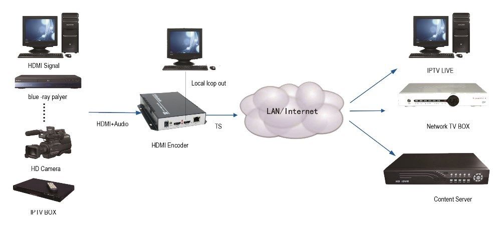 El codificador HDMI H.264 es nuestro dispositivo de codificación de audio y video HD profesional más nuevo con una funcionalidad potente. Es compatible con la codificación H.264, datos de doble transmisión. Está equipado con 1 entrada de canales HDMI compatible con formato de código de perfil alto MPEG-4 AVC / H.264 y formato de código de perfil principal. Su alta integración y su diseño rentable hacen que este dispositivo sea ampliamente utilizado en una variedad de sistemas de distribución digital, como cabecera digital CATV. televisión digital por satélite y terrestre, etc.it puede admitir la decodificación de VLC y Postplayer.