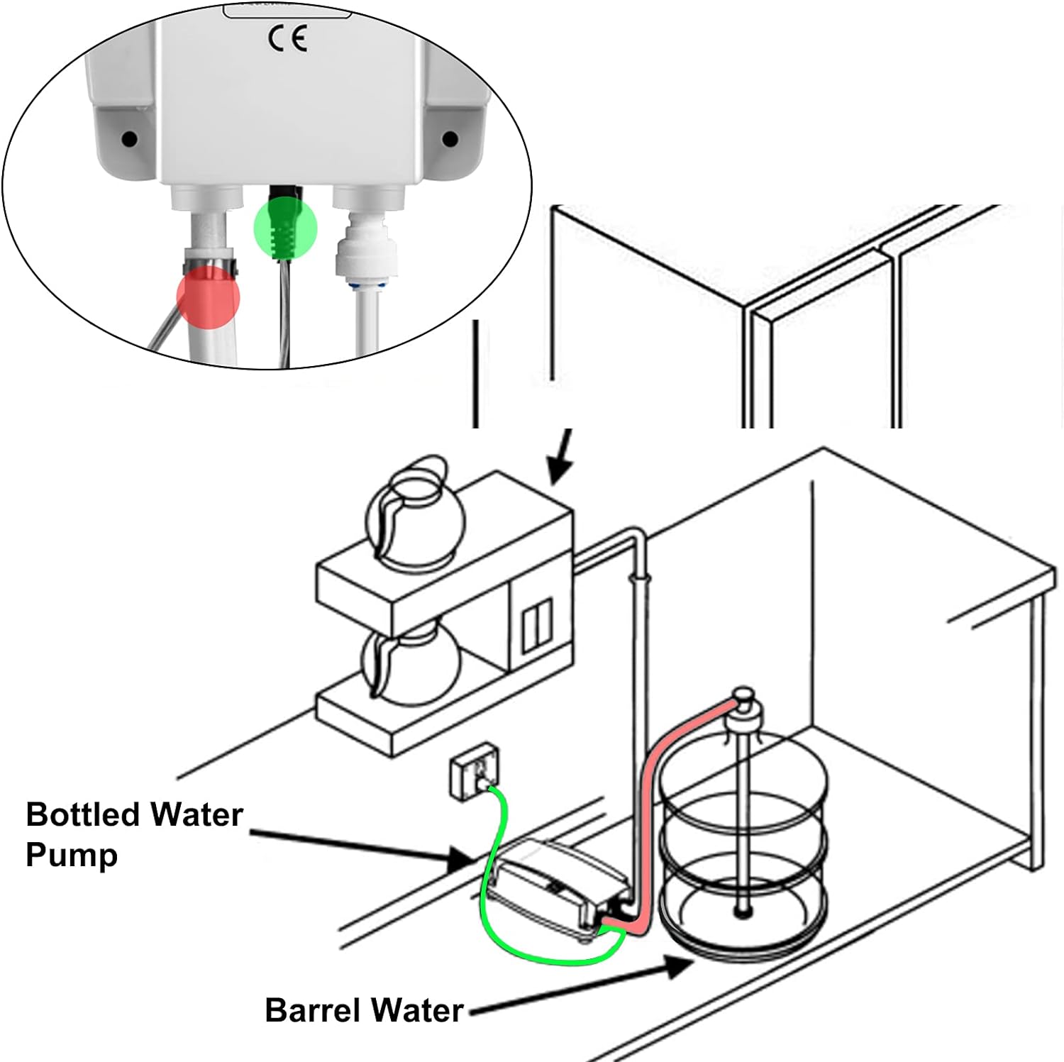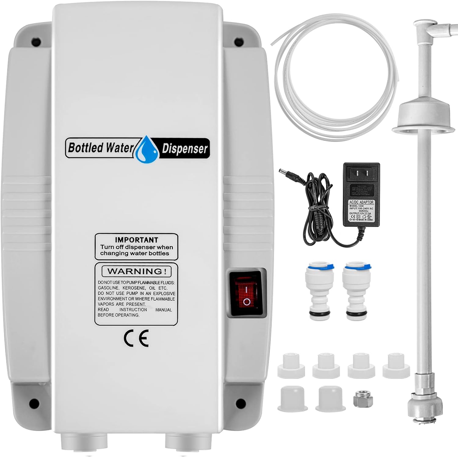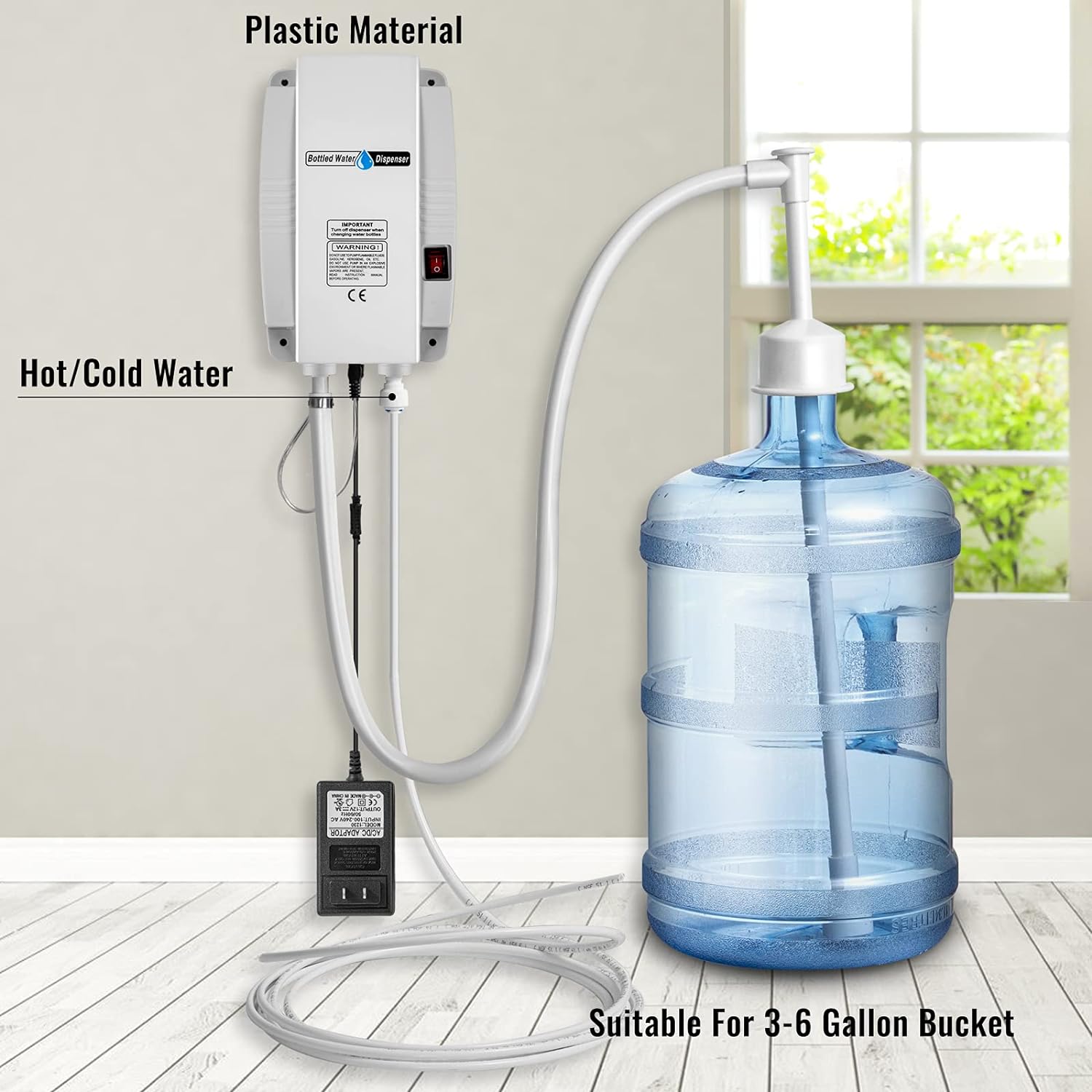 -BOMBA DE AGUA PARA BOTELLA: este sistema de bomba dispensadora de agua de 110 V es ideal para botellas de agua de 3 a 6 galones. La bomba de agua tiene una presión máxima de 40 PSI (2,8 bar) y suministra agua a presión a un grifo de agua potable individual, proporcionando agua fría o caliente en cualquier momento.