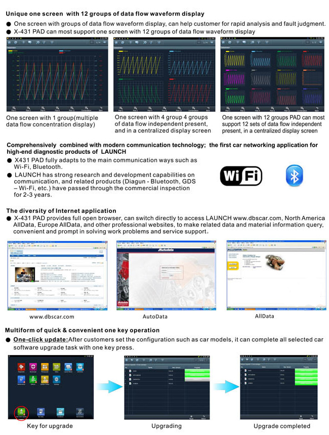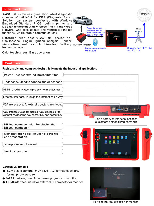 Cuenta con funciones precisas por marca y modelo, accede a todos los módulos del vehículo como son: sensores de llantas, tableros, luces, aire acondicionado, tren motriz, radio, quemacocos, etc, siempre y cuando la computadora del vehículo soporte dichas funciones.
