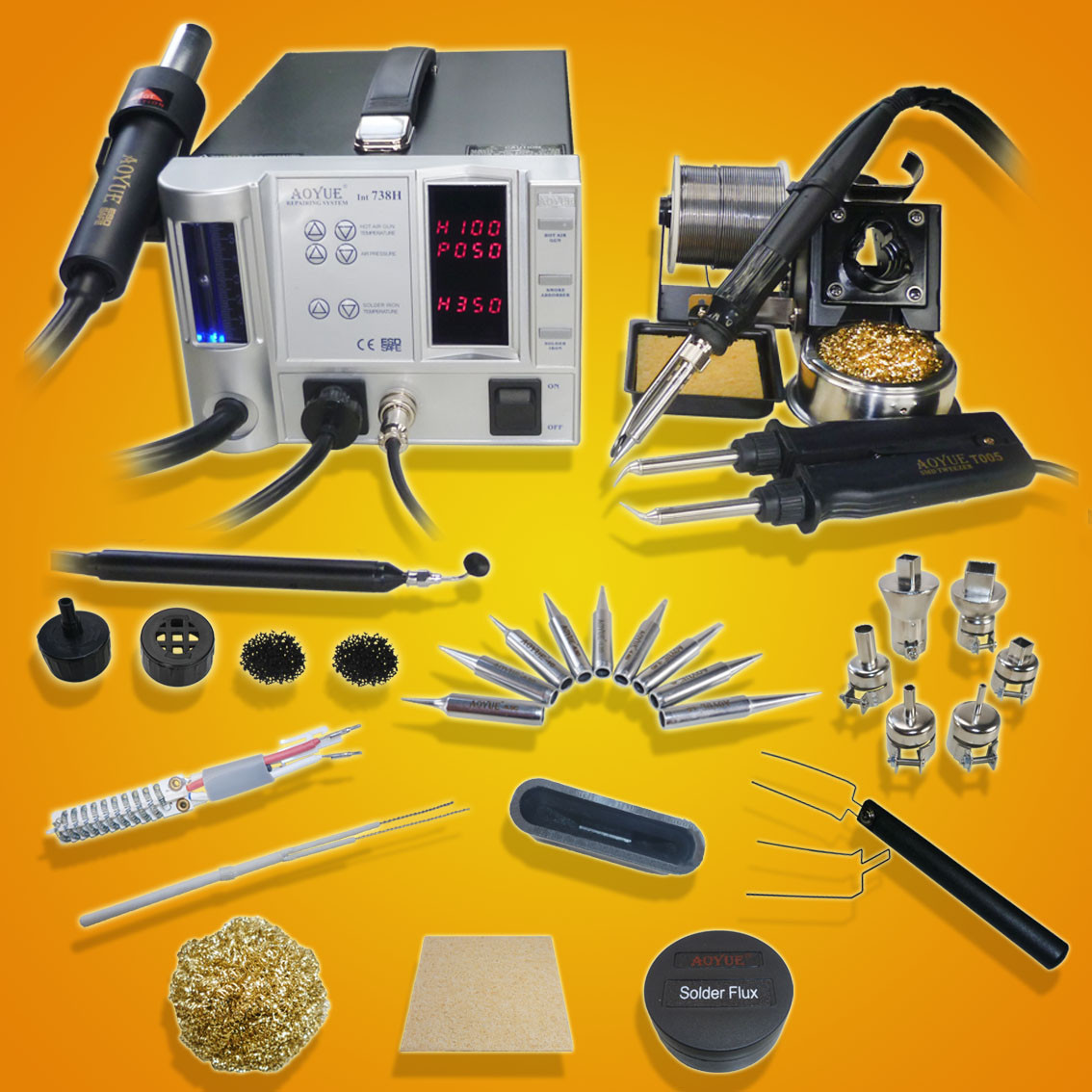 El NUEVO 738H sólo está disponible en SRA Soldering Products. Esta estación 5 en 1 tiene un hierro de soldadura 70, pistola del aire caliente de 600 vatios, herramienta de la recogida del vacío, absorbedor de humos y pinzas de soldadura. También incluye una caja de herramientas agradable para la celebración de todos los consejos y accesorios.