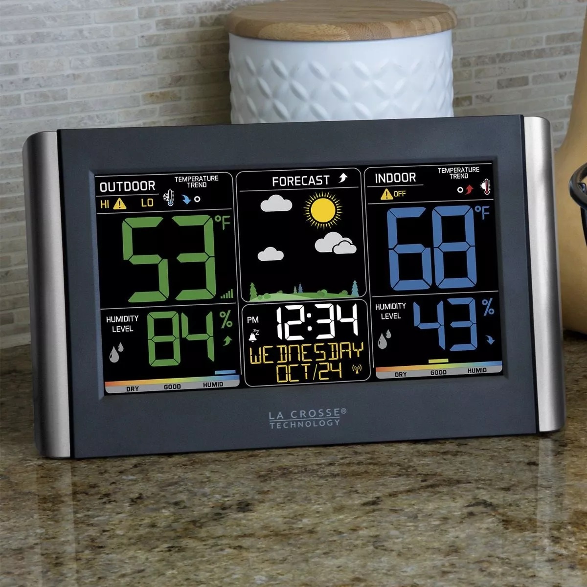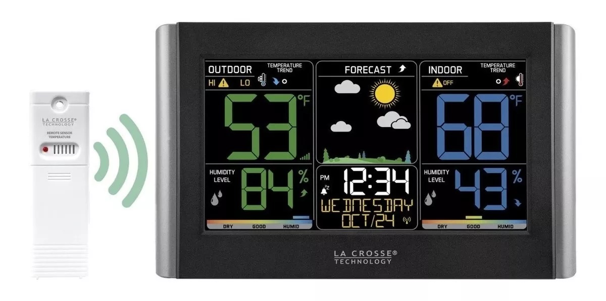 La Estación Meteorológica Inalámbrica más nueva de La Crosse Technology es fácil de usar y la configuración es rápida e intuitiva. La estación cuenta con iconos de pronóstico de color animados, indicadores de nivel de confort y temperatura y humedad interior / exterior. Todas estas características y más se muestran en una pantalla LCD a color brillante y fácil de leer.