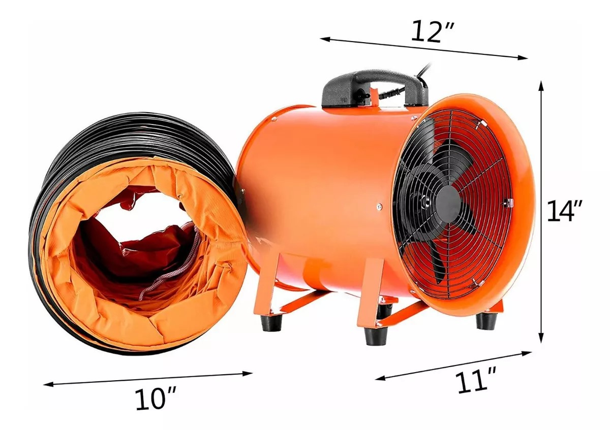 -Alta eficiencia: el motor de cobre puro de 320 W, velocidad de 2800 y 3300 r/min, ventilador eléctrico con 7 aspas y un diámetro de 10 pulgadas, rodamiento de bolas y estructura estable pueden proporcionar un gran flujo de aire (43 m³/min), logrando así una ventilación rápida y eficiente y máxima extracción de aire, proporcionando flujo de aire direccional para áreas de acceso limitado y mejorando la eficiencia de su trabajo.