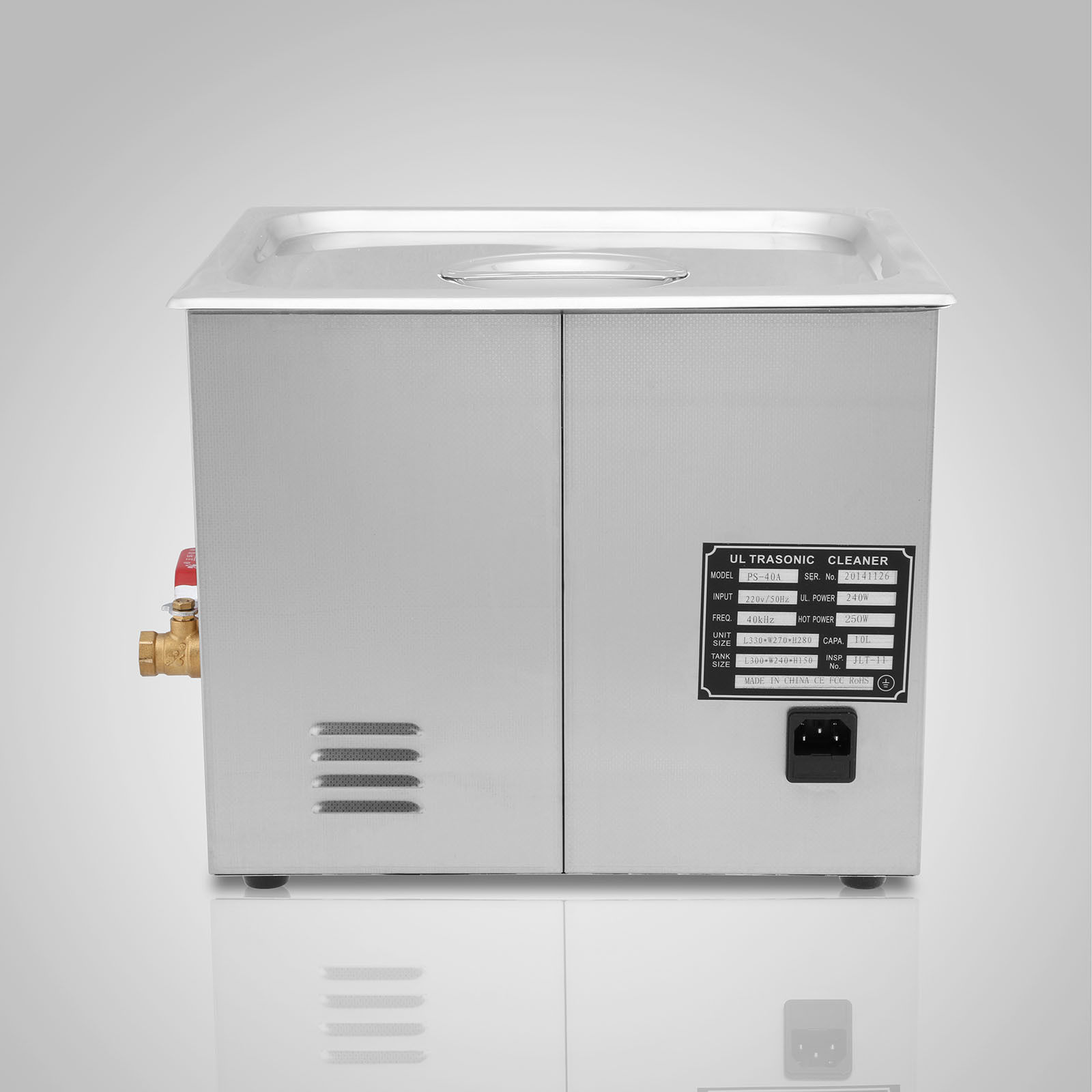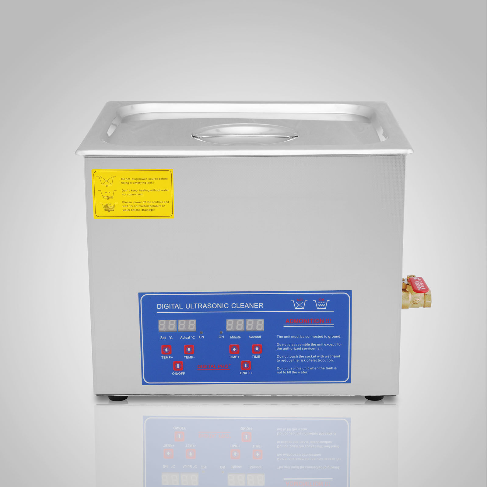 Construcción duradera de acero inoxidable. La limpieza ultrasónica y la calefacción pueden funcionar al mismo tiempo. Limpieza de alta eficiencia para partículas de manchas pequeñas. Gran temporizador digital y pantalla de temperatura para el tiempo preciso de lavado y control de temperatura. CE, FCC y RoHS aprobados. El transductor potente incorporado puede consolidar la energía ultrasónica y hacer el resultado superior de la limpieza. Cesta de limpieza de acero inoxidable para la limpieza de algunos objetos pequeños que necesitan menos fricción, puede reducir la fricción entre los pequeños objetos y el tanque. Tapa ajustada de acero inoxidable con mango para evitar que el calor del agua se difunda. Drenajes con válvula de control de flujo para una fácil limpieza y enjuague. Pies de goma antideslizantes. Utilice sólo agua del grifo para limpieza general, también puede añadir unos 5-10 ml de detergente en agua para mejorar el resultado de lavado cuando sea necesario. Ahorre el solvente de limpieza, la energía térmica, el lugar de trabajo y el trabajo.