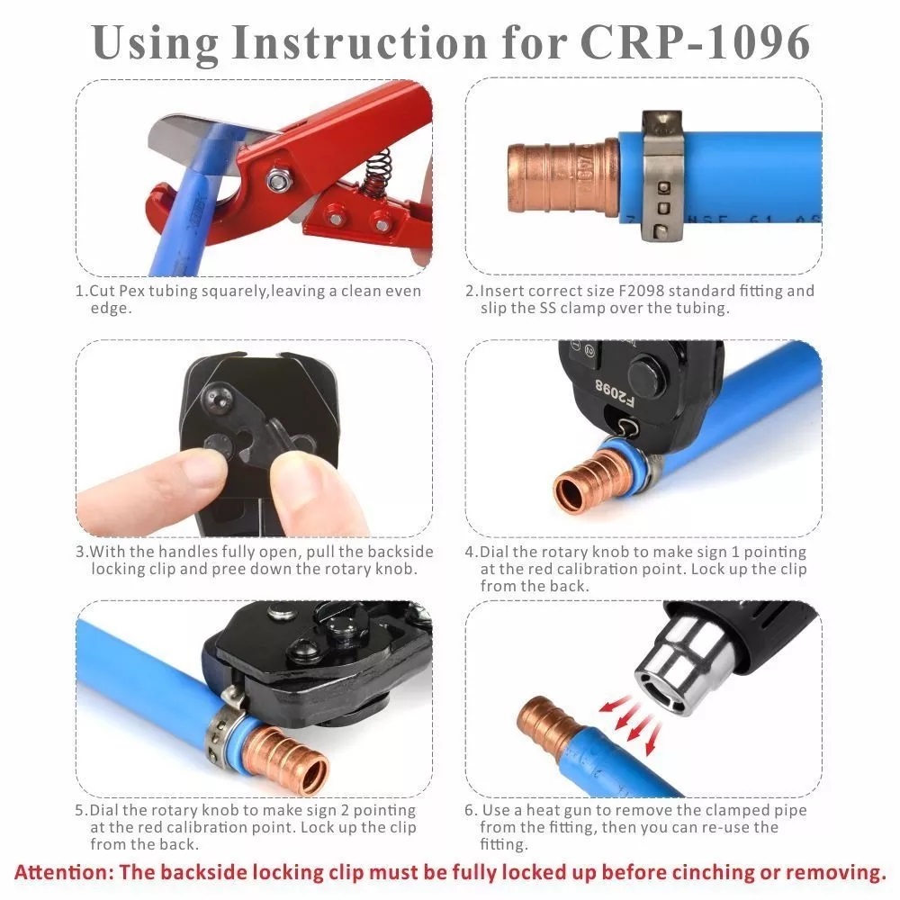 -Esta herramienta cumple con la norma ASTM 2098, funciona con abrazaderas de acero inoxidable de cualquier fabricante para hacer conexiones PEX de 3/8 pulg a 1 pulg