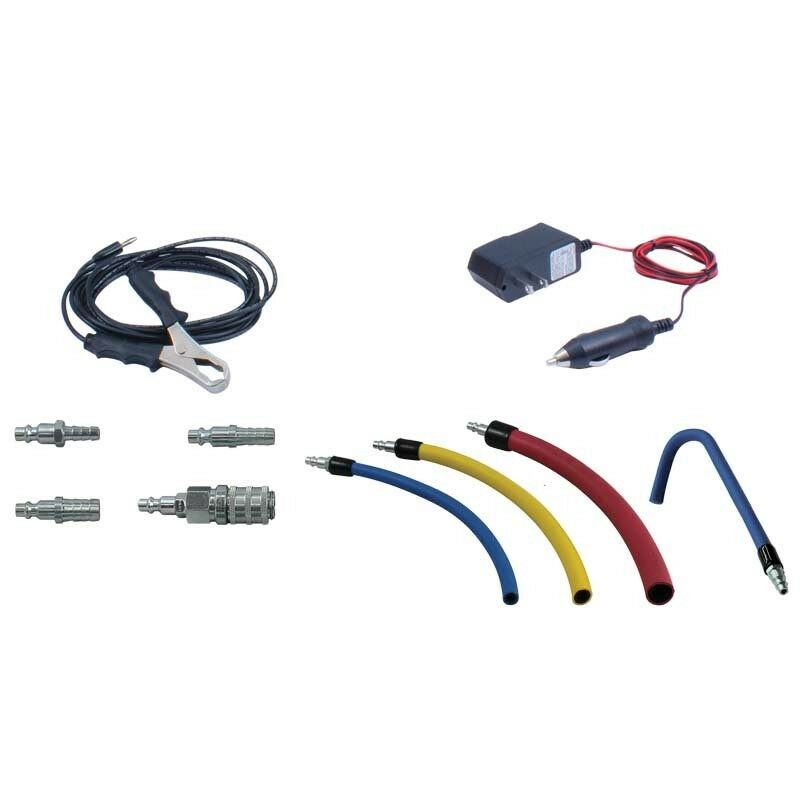 INCLUYE: 3 adaptadores de manguera estándar, adaptador de dispensación de fluidos, conexiones de combustible de 1/4 ", 3/8" y 1/2 ", Compucheck Fitting, cargador de batería de 500Ma, Cable de tierra del chasis