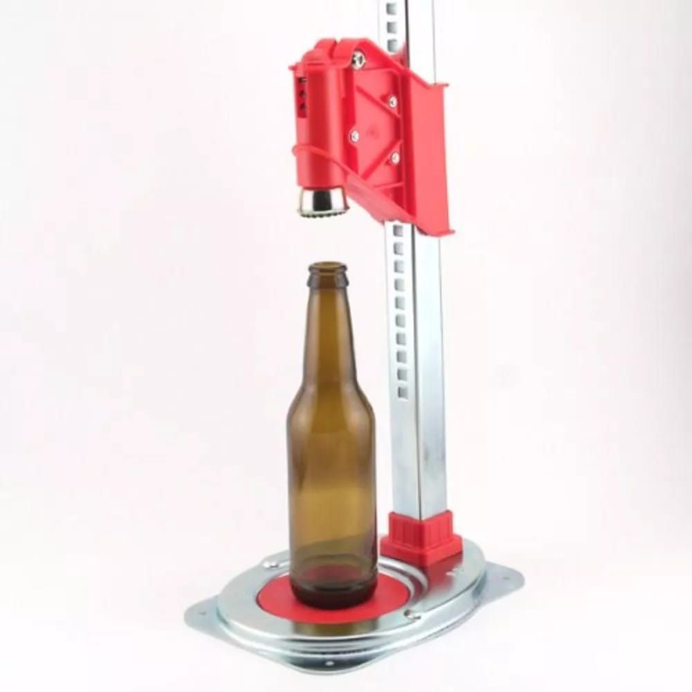 -Mecanismo de taponamiento de botella ajustable montado en resorte. Se puede colocar sobre una encimera, escritorio o incluso en el suelo. Debido a que es ajustable, Bench Capper funciona con varios tamaños de botellas. Incluye un imán en el dispositivo para mantener la gorra en su lugar.