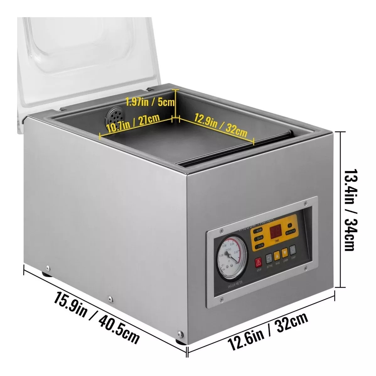 -EFECTO DE VACÍO EXTRAORDINARIO - Potencia del motor: 0,12 KW; Tamaño de sellado efectivo (L x W): 10 "x 0,24" (255 mm x 6 mm); Velocidad de la bomba de vacío: 3 m3 / h; Dimensiones de la cámara: 12,9 '' x 10,8 '' x 2 '' (330 x 275 x 50 mm) Excelente rendimiento de succión y sellado El espacio de la cámara es suficiente para un empaque normal.