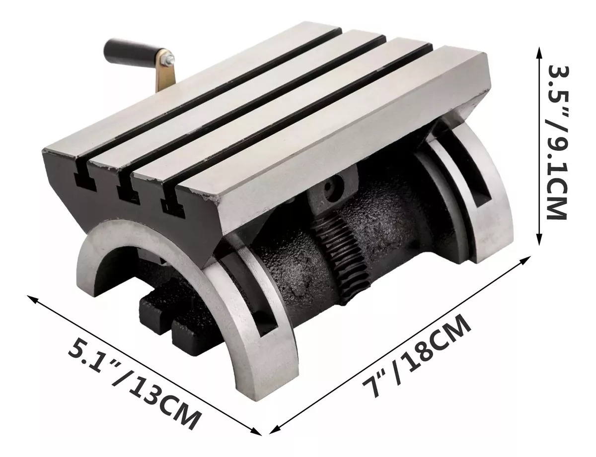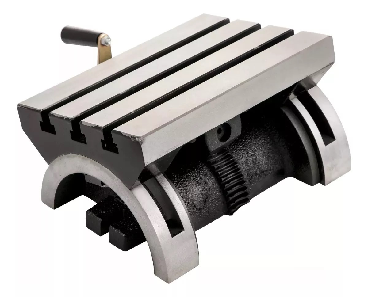 -Mesa de fresado basculante ajustable: Esta mesa inclinable para fresadora, hecha de hierro fundido de alta resistencia, se puede ajustar de 0 a 45 grados (ambos lados), con 3 ranuras en T (10 mm), una manivela y un acabado esmerilado de precisión, es una herramienta perfecta para mejorar su procesamiento de fresado.