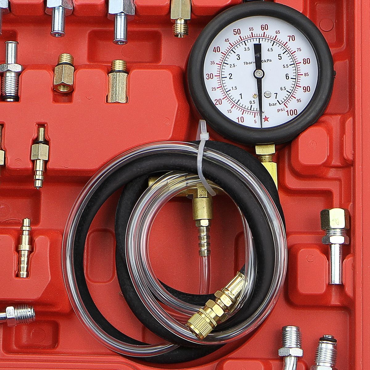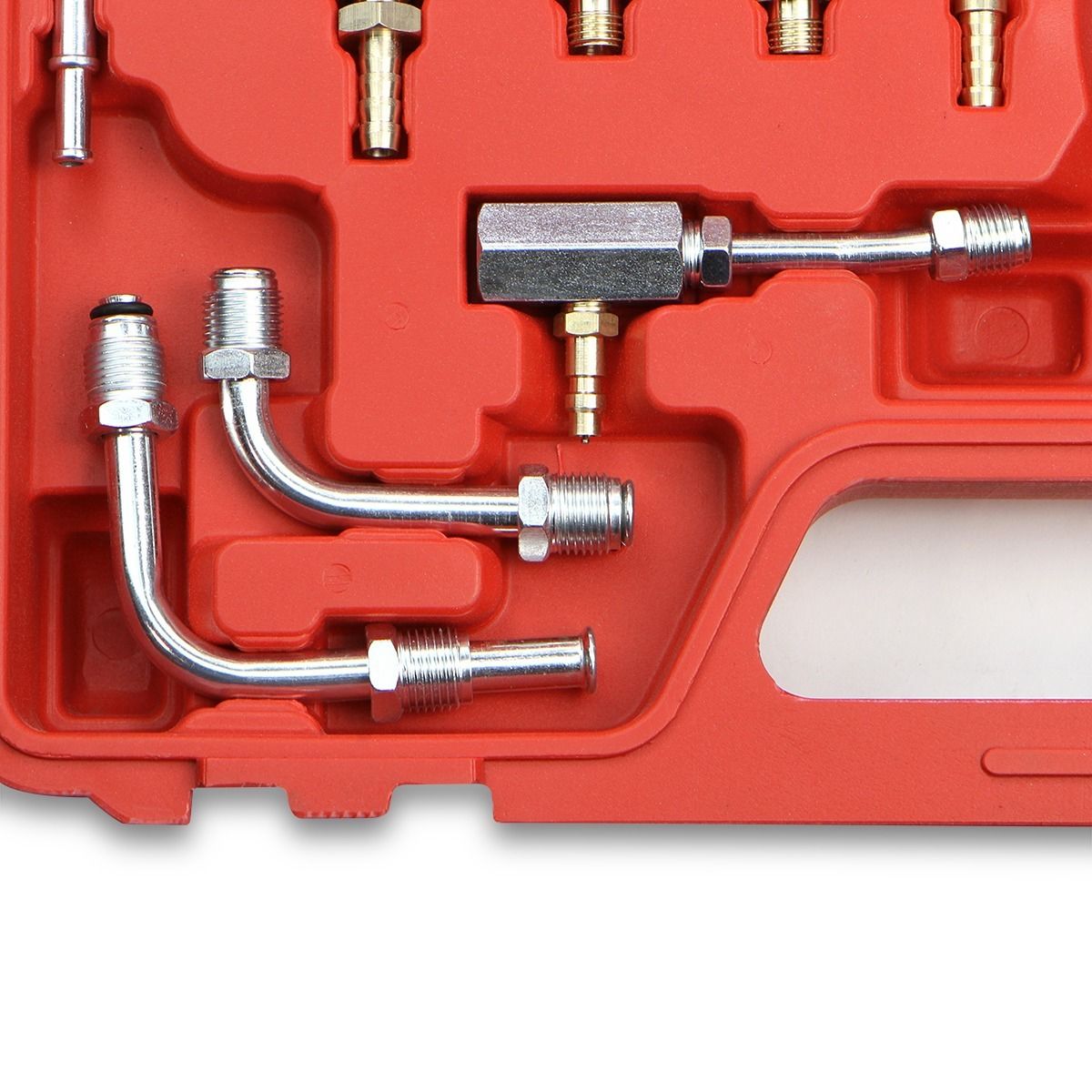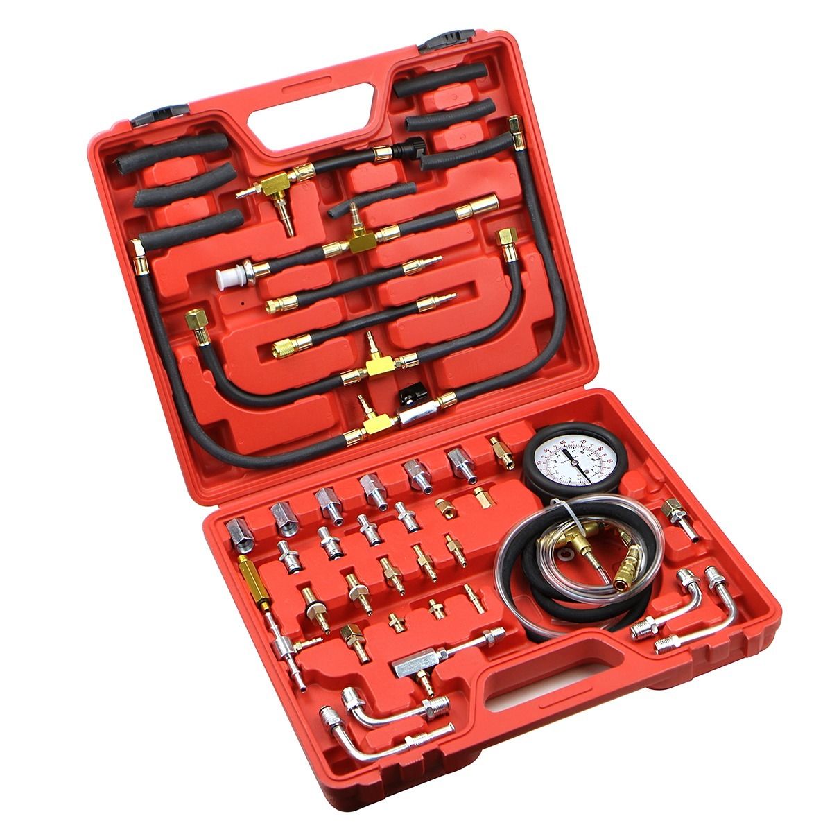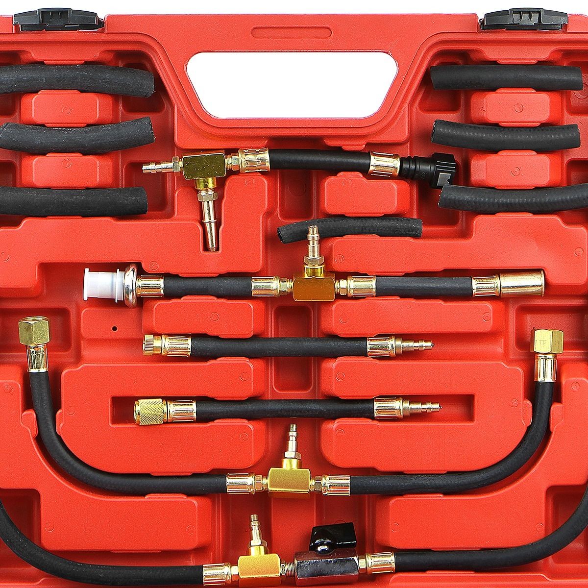 ¡Los adaptadores, mangueras y accesorios incluidos cubren todos los sistemas de inyección de combustible y la mayoría de los coches y camiones en todo el mundo!