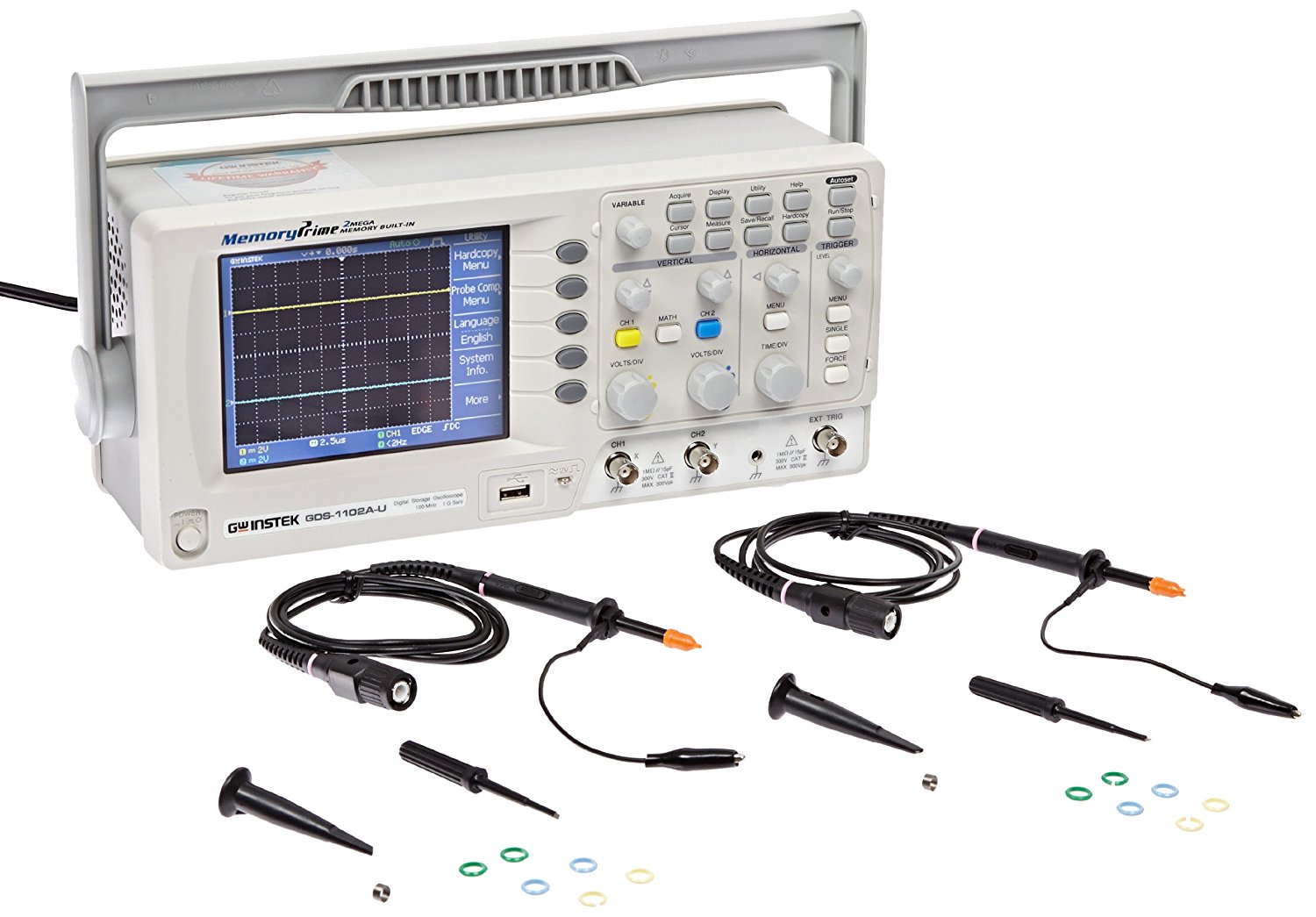 La serie GDS-1000A-U proporciona una solución única. La línea GDS-1000A-U incluye tres modelos GDS-1152A-U, GDS-1102A-U y GDS-1072A-U. Operando a 150, 100 o 70 MHz con una tasa de muestreo en tiempo real de 1GSa / s, el GDS-1102A-U emplea la tecnología MemoryPrime. Al utilizar la tecnología MemoryPrime, el GDS-1102A-U puede superar los problemas asociados con las limitaciones de memoria. Las tasas de muestreo altas, que raramente se encuentran en DSO tradicionales, se pueden mantener durante períodos de tiempo más largos, sin afectar el rendimiento. Junto con la pantalla TFT de 5,7 colores de alta resolución, con una interfaz de usuario amigable, el dispositivo USB y el puerto de host hacen que la serie GDS-1000A sea rica en funciones.