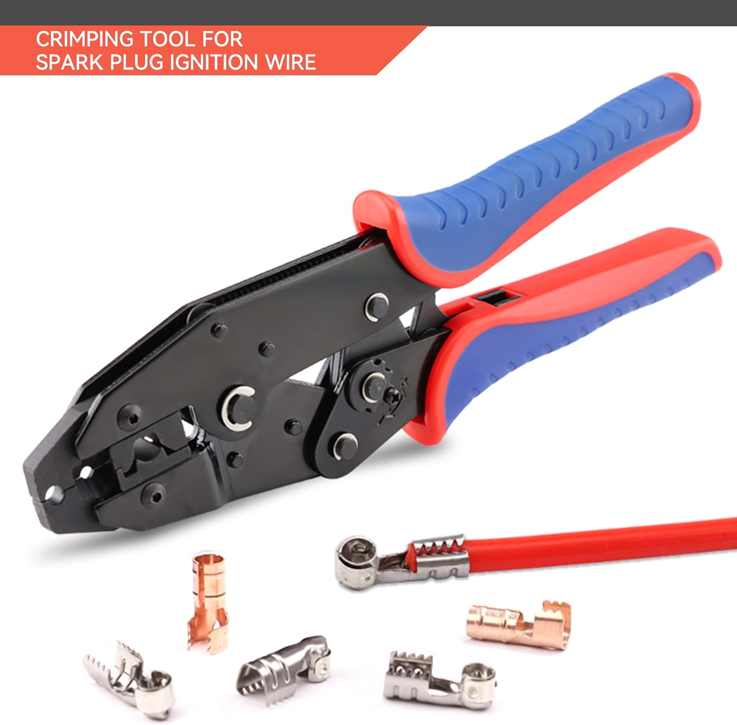 -Herramienta de crimpado de cables de bujía, crimpadora de alambre de 8,5 mm; la mejor herramienta de prensado de cables disponible para hacer juegos de cables personalizados o cableado. Construido con un marco de acero endurecido resistente con empuñaduras antideslizantes moldeadas. Un mecanismo de carraca ajustable produce engarces consistentes de alta calidad estilo de fábrica. Esta herramienta especial es una forma económica de hacer un conjunto de cables de enchufe personalizados. Proporciona un troquel para pelar ya sea de núcleo de hélice de 8 mm o cable súper conductor de 8,5 mm, para proporcionar un crimpado de terminal sólido al cable.