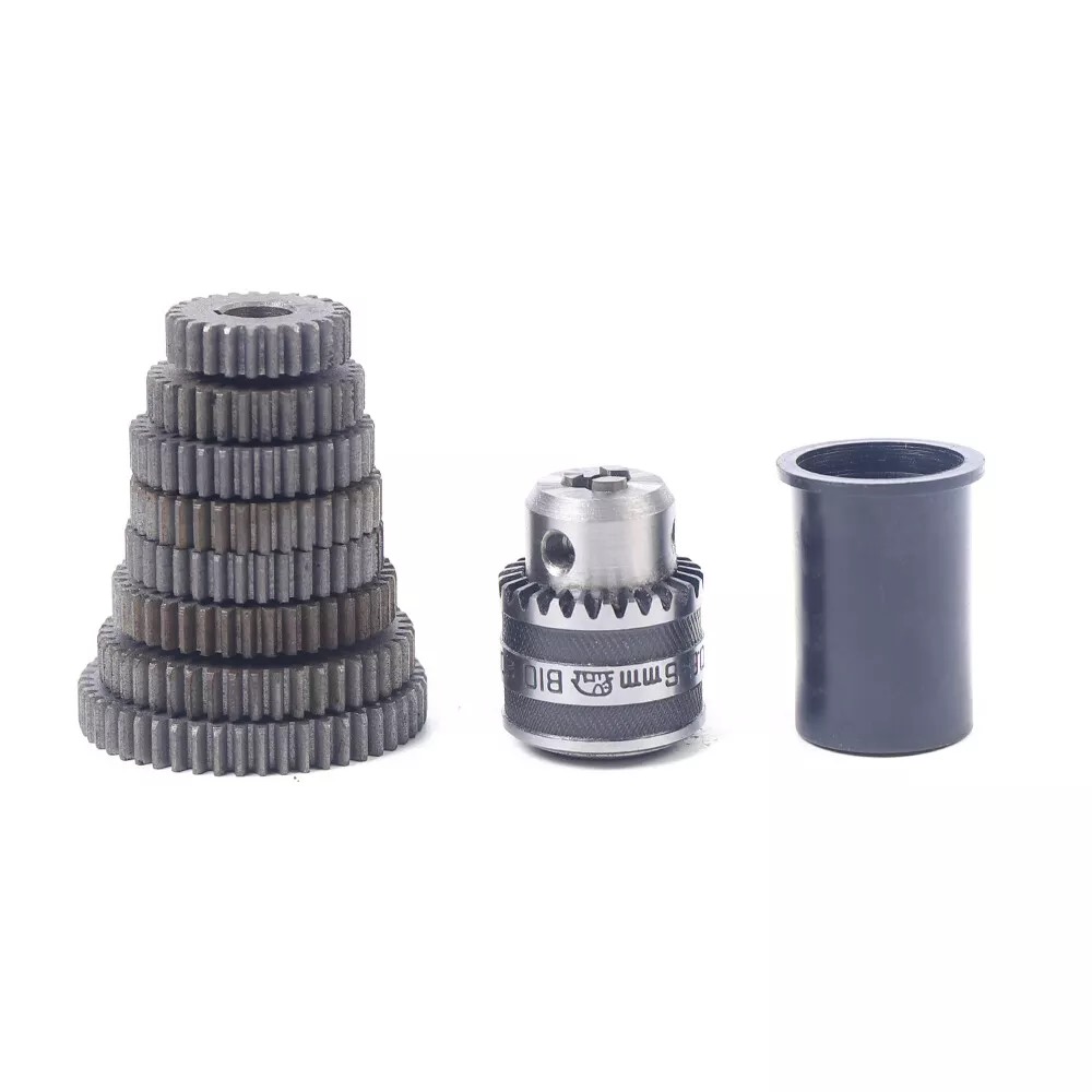 -Detalle: Riel de cola de milano: la bancada adopta un riel guía de cola de milano, la superficie de contacto es más grande y más estable. Mandril de tres mordazas: esta máquina tiene un mandril de tres mordazas de alta precisión de 80 mm. Cabezal de perforación y fresado: se puede girar 360°, subir y bajar dentro de un rango de 80 mm. Engranajes/poleas de perforación y fresado: a través de la posición de la correa trapezoidal, el husillo de perforación y fresado puede alcanzar 10 tipos de velocidad de rotación.